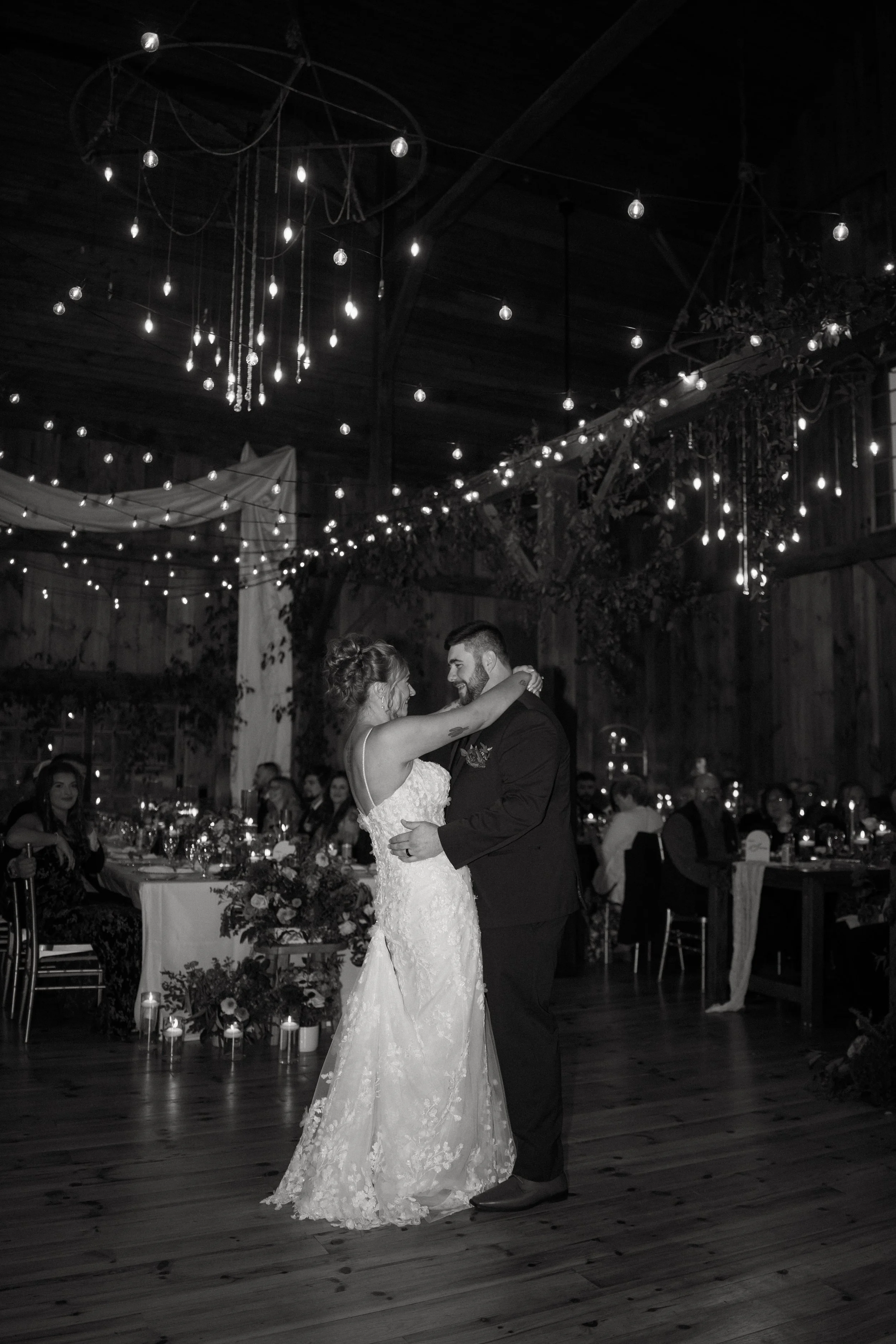 2,600 square foot heated & restored batten barn with gorgeous chandeliers! Oversized ceiling fans are in use for summer events. The barn is insulated and heated for winter events.